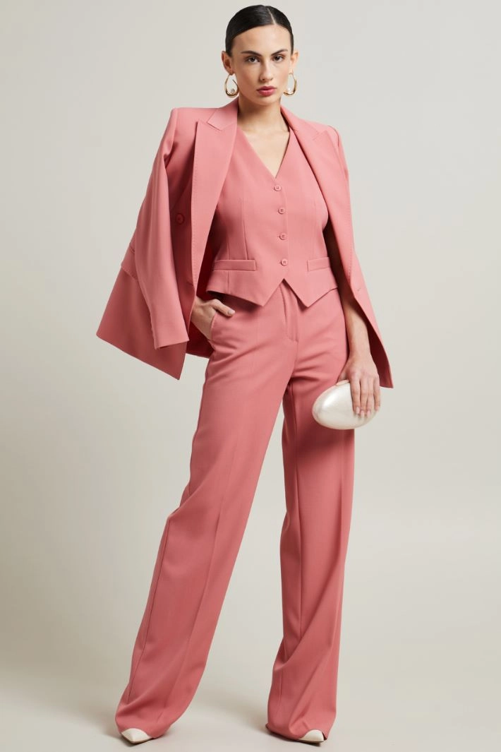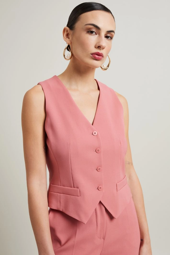 Fitted gilet in pure wool crepe, with V-neck, sleeveless, side welt pockets, adjustable strap on the back and single-breasted fastening with buttons. Lined.