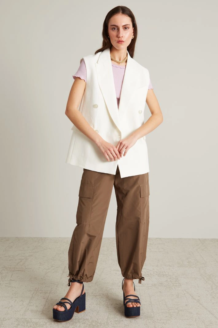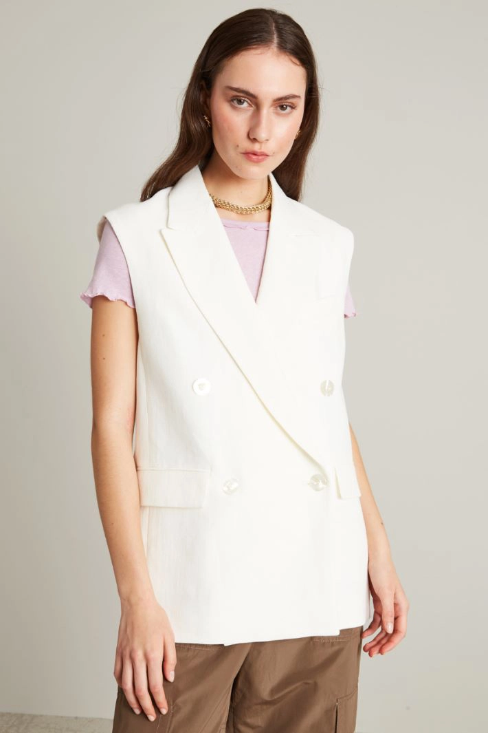 Straight-fit waistcoat in pure linen fabric, with lapel collar, sleeveless, pocket, double-welt side pockets with flap and central vent on the back. Double-breasted fastening with buttons. Partially-lined.