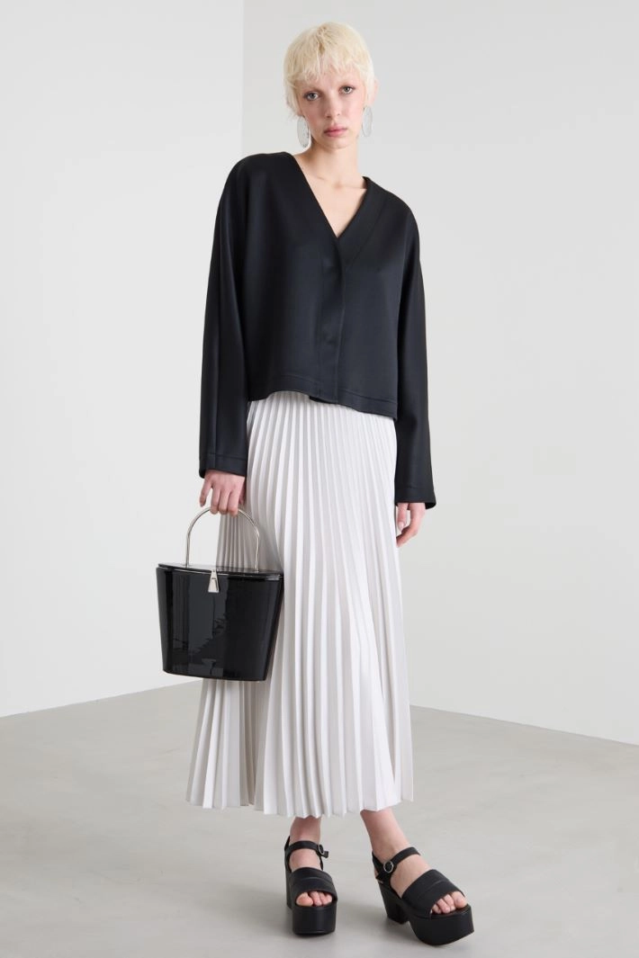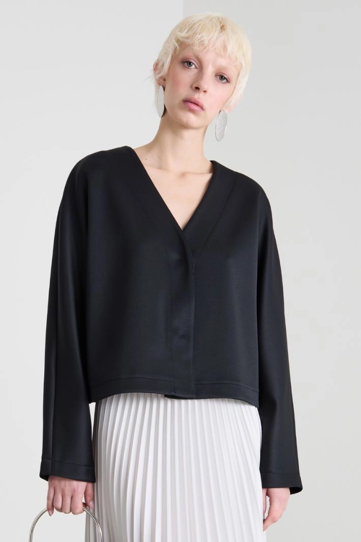 Straight-cut jacket in heavy jersey with a crepe texture, with stitching details that finish the garment, V-neck and long kimono sleeves. Fastening with hidden press studs on the front.