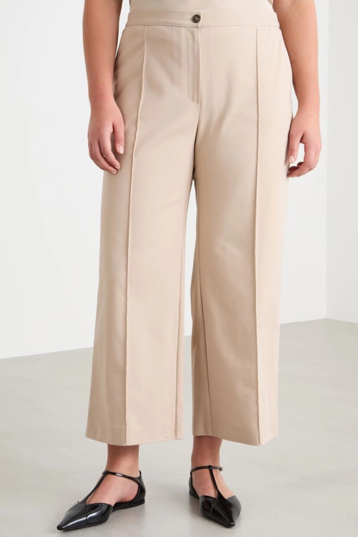 Wide-leg trousers in a cotton blend, with French pockets and a stitched pintuck down the front. Fastening with a button and a concealed zip.