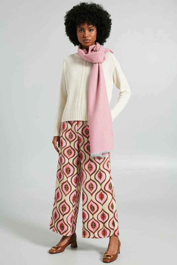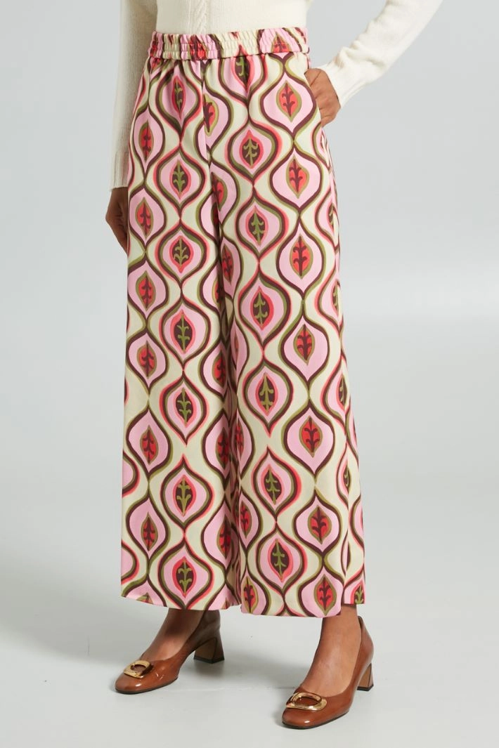 Cropped trousers with a straight and soft fit in printed shiny envers satin, with elasticated waistband and French side pockets.