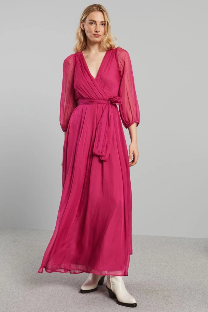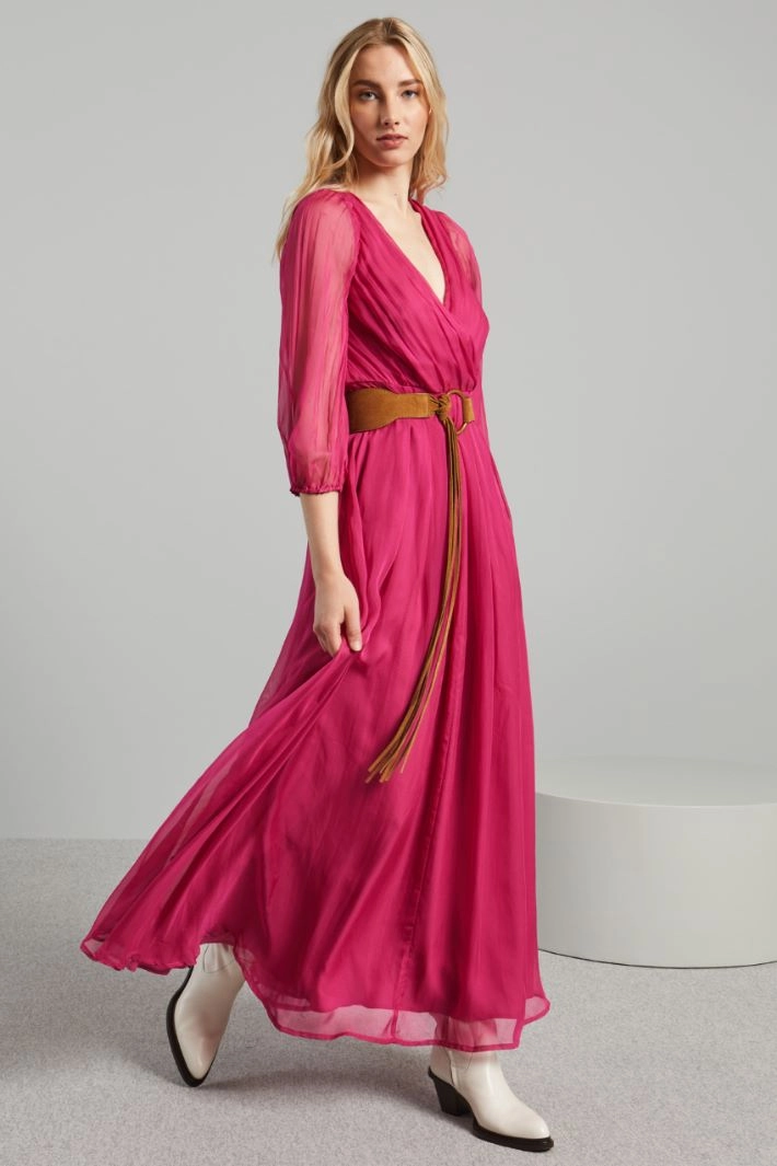 Made from delicate chiffon, this longline dress is pleated through the top and trimmed with subtly puffed-up three quarter-length sleeves. Defined at the waistline with a matching sash, it falls into a full, softly pleated skirt.