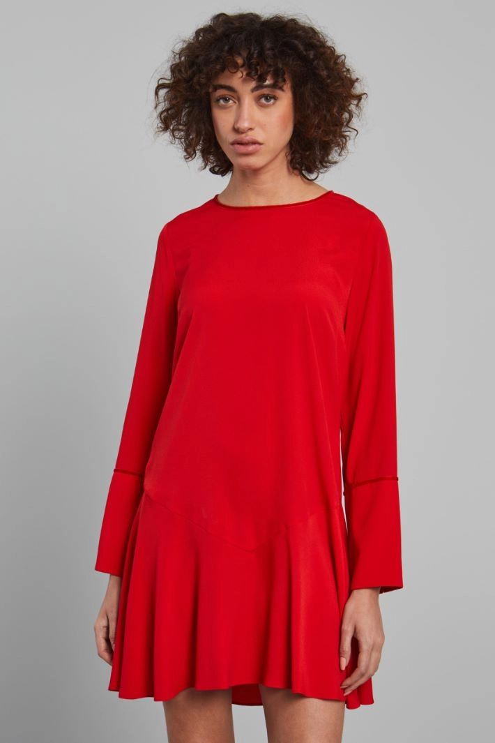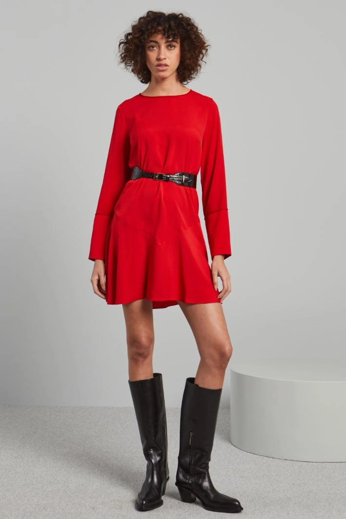A-line dress in crepe de chine, with round neckline, long sleeves with long cuff and buttons, velvet details and flounce at the hem. Invisible zip fastening on the back.