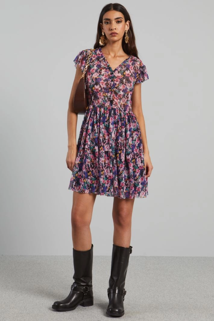 Short dress in all-over printed tulle crepe jersey, with a V-neck, short cap sleeves, gathered waist and small flounce at the bottom. Fastening with visible buttons on the front. Matching ring belt. Semi-lined.