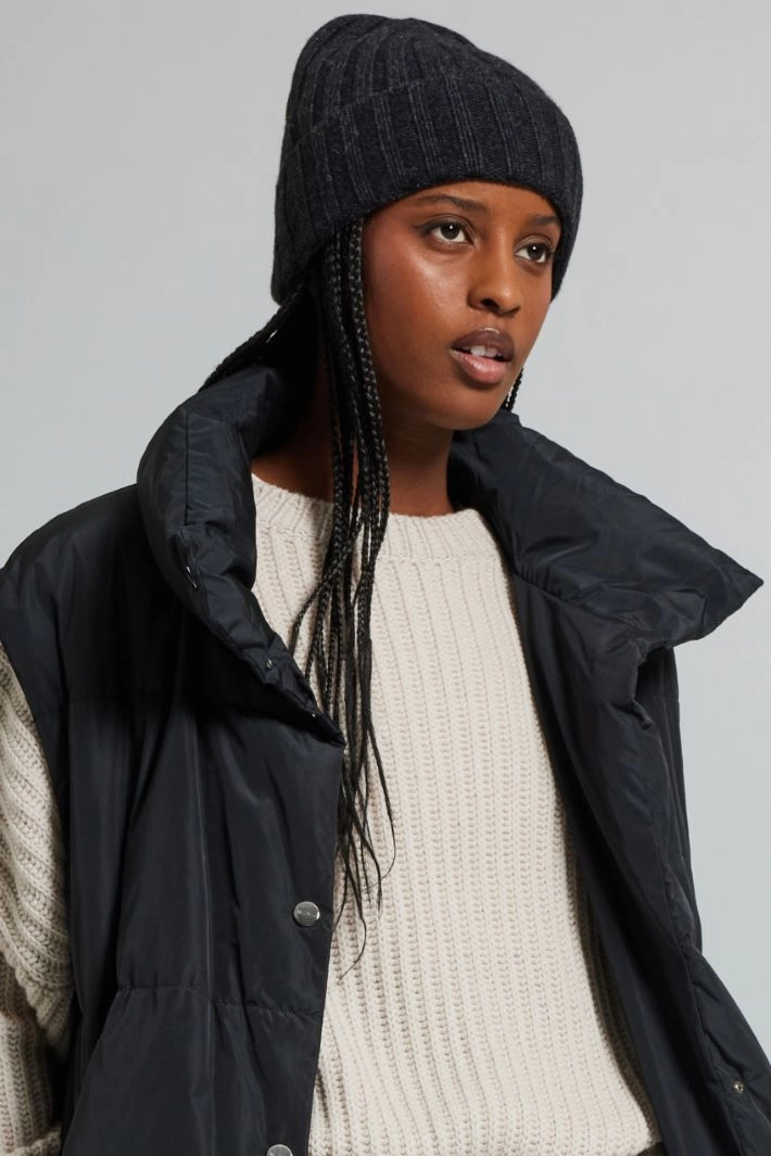 Beanie in wool, viscose and cashmere yarn, with ribbing and turned-up bottom.