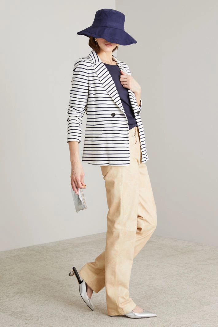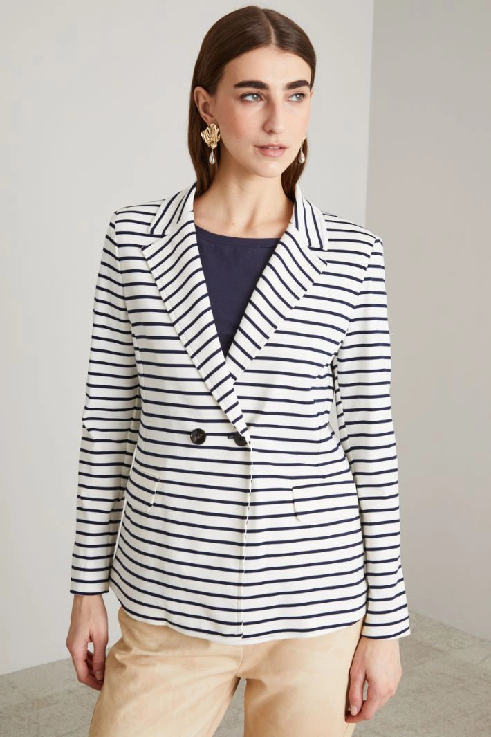 Straight-fit blazer in stretch viscose blend jersey, with lapel collar, long sleeves, double-welt pockets with flap. Double-breasted button fastening. Unlined.