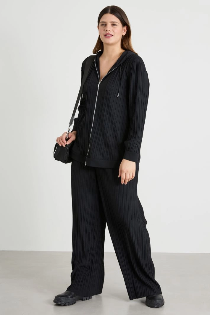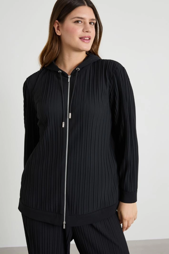 Straight-cut sweatshirt in pleated jersey, with drawstring hood, long sleeves with cuffs and double-slider zip fastening.