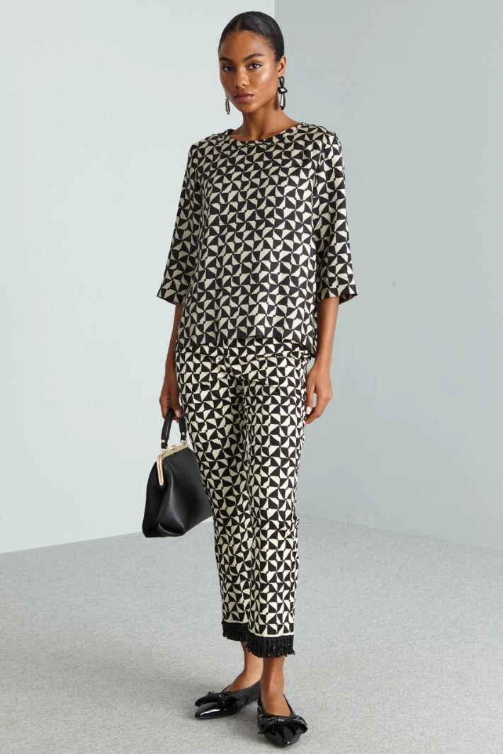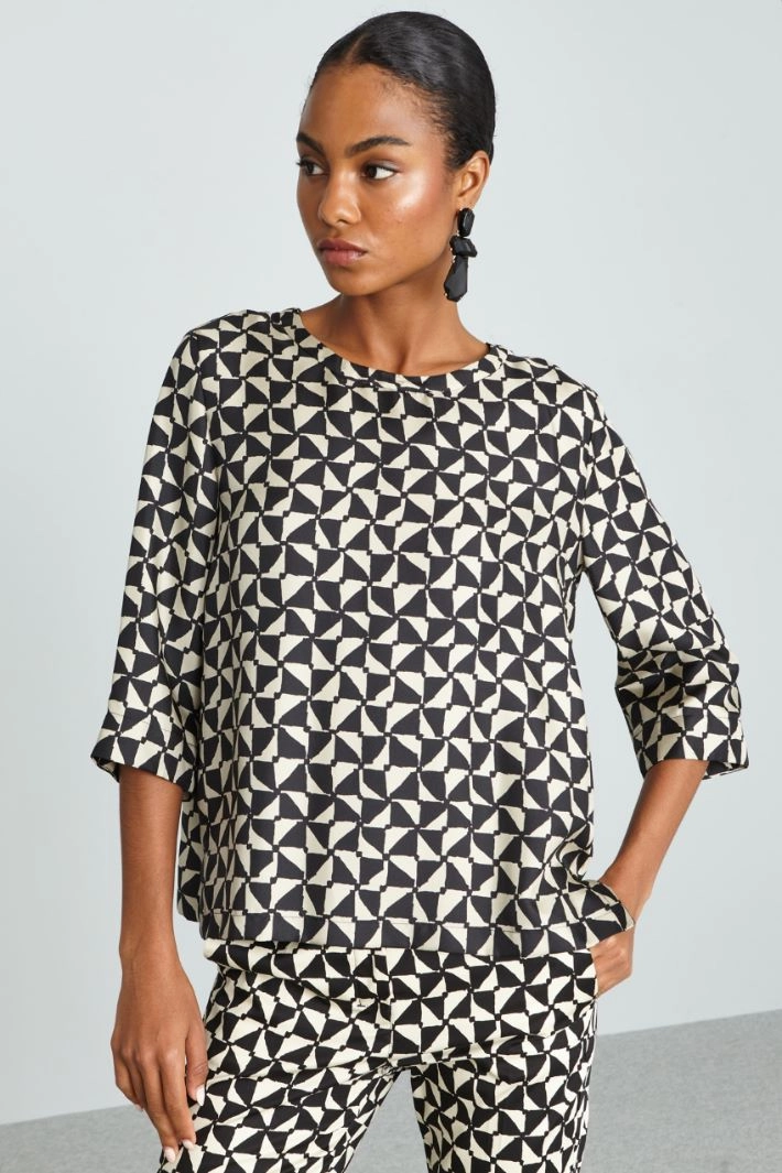 Loose-fit blouse in printed silk twill, crew neck, three-quarter sleeves and slits at the bottom. Button fastening at the back.