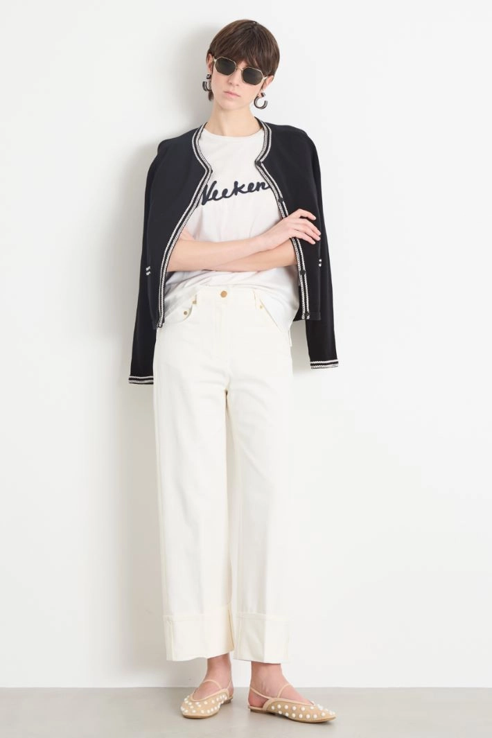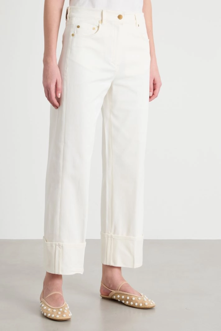 Straight-fit trousers crafted in stretch cotton bull denim, featuring belt loops, scoop pockets on the front, patch pockets on the back, and deep turn-ups. Fastening with a button and a concealed zip.