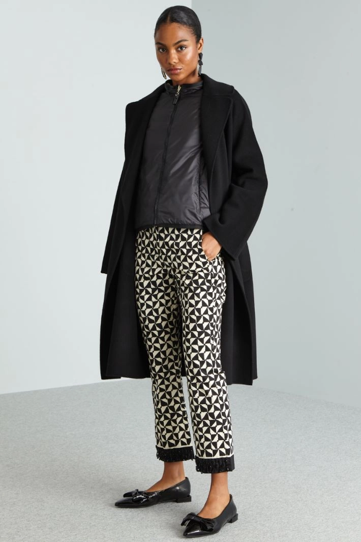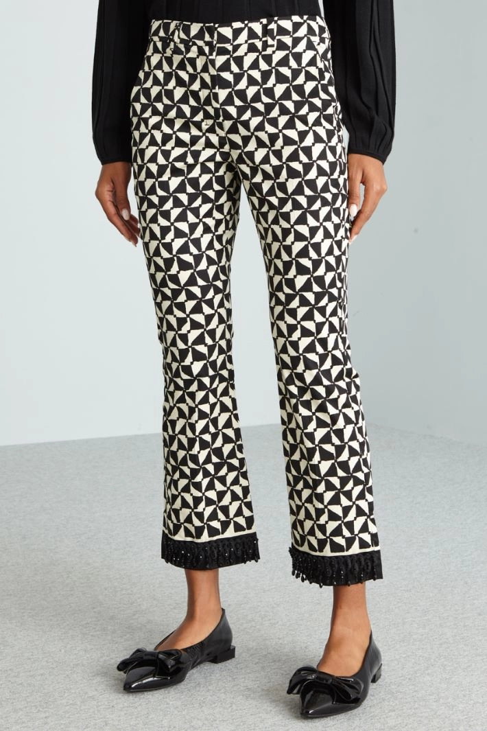 Straight-leg trousers in printed cotton satin, with belt loops and waistband, French pockets, beaded details on the bottom. Fastening with zip, button and hidden hooks.