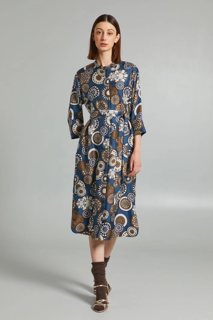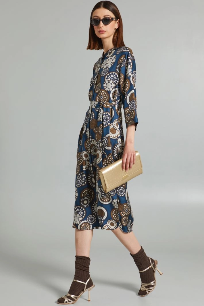 Shirt dress in printed pure silk twill, with removable jewel applications on the neckline, Mandarin collar, three-quarter sleeves with vents and inset side pockets. Model with yoke cut and box pleat on the back, hidden button fastening and matching sash.