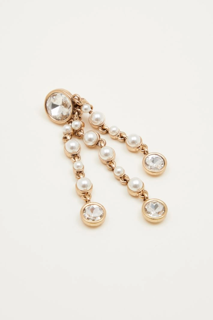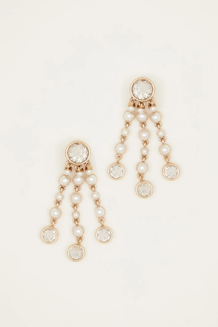 Chandelier earrings featuring geometric elements of varying sizes, adorned with pearls and rhinestones. Clip fastening.